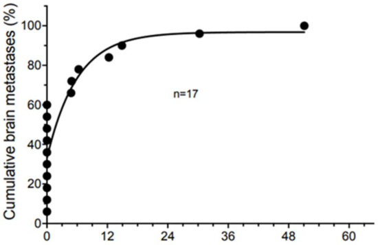 Time to diagnosis of brain metastases from onset of metastatic melanoma. Each point represents an individual patient.
