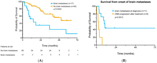 Of our 85 patients who were treated with ICI, only 17 patients developed brain metastasis at any point during their therapy (20.0% overall incidence). The individual characteristics of the patients who developed brain metastases is shown (Table 1). These included nine men and eight women. The median age of patients with brain metastases was 59.0 ± 11.1 years. Of the 17 patients with CNS involvement in our series, 2 had BRAF fusions/rearrangements (40.0% of total BRAF fusion/rearrangement patients) and 9 patients had BRAF V600 locus mutations (32.1% of all BRAF mutant patients). A total of four patients had an NF1 mutation (17.4% of all NF1 mutant patients), and one had an NRAS mutation (6.7% of all NRAS mutant patients). The only patient with a CKIT mutation developed delayed onset of brain metastases. No quadruple-negative patient developed brain metastases.