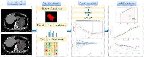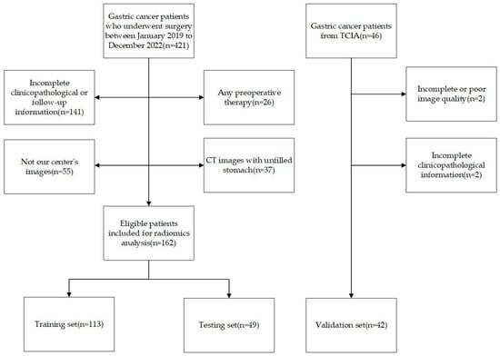 This study analyzed clinicopathological and contrast-enhanced computed tomography (CECT) data from 162 patients treated at the Second Affiliated Hospital of Nanjing Medical University from January 2019 to December 2022. The inclusion criteria were as follows: (1) CECT was performed less than 2 weeks before surgery and (2) the patients had a pathological diagnosis of gastric cancer. The exclusion criteria were as follows: (1) patients with unfilled stomachs; (2) patients with poor CECT quality; (3) patients with combined severe primary disease; and (4) patients with incomplete clinical data or follow-up information. The workflow of the inclusion and exclusion is shown in Figure 1. Our study was approved by the ethics committee of the Second Affiliated Hospital of Nanjing Medical University (2023-KY-162-01), and the patients’ or their family members’ informed consent was acquired. Our study adhered to the Image Biomarker Standardization Initiative (IBSI) guidelines and the Declaration of Helsinki [17].