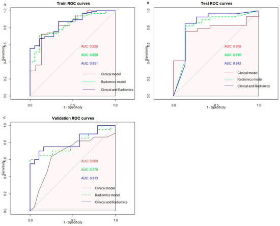 (A) ROC curves of three models in the training set. (B) ROC curves of three models in the testing set. (C) ROC curves of three models in the validation set.