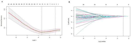 (A) A 10-fold cross validation was used to select the optimal “Lambda” value. (B) The different colors referred to different features. The best “Lambda” value was used to select features.
