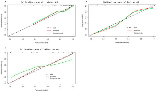 The calibration curves of the training set (A), testing set (B) and validation set (C).