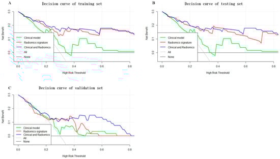 The decision curves of the training set (A), testing set (B) and validation set (C).