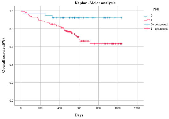 The median OS time of the 162 patients was 542 days (range: 7–1038 days). Of the 162 patients, 34 patients had no PNI, and 3 among them died. In total, 128 patients had PNI, and there were 33 deaths in this group. As shown in Figure 8, there was a statistically significant difference in OS between the PNI group and the non-PNI group (p < 0.05).