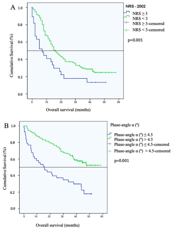 (A) Median overall survival of patients with Nutritional Risk Screening (NRS)-2002 ≥ 3 vs. NRS-2002 < 3 (p = 0.001) where Kaplan–Meier analysis curve was created according to NRS 2002. (B) Median overall survival of patients with phase angle α ≤ 4.5° vs. phase angle α > 4.5° (p = 0.001) where Kaplan–Meier analysis curve was created according to phase angle α.