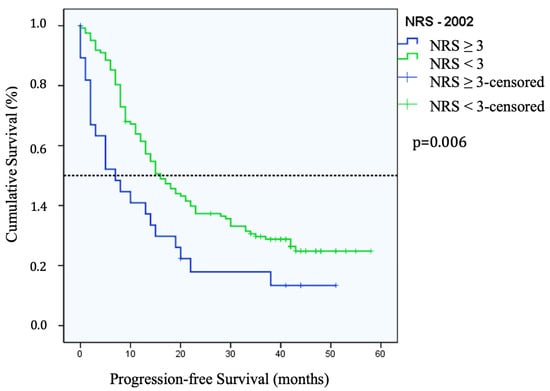 Median progression-free survival in patients with Nutritional Risk Screening (NRS)-2002 ≥ 3 vs. NRS-2002 < 3 (p = 0.006) where Kaplan–Meier analysis curve was created according to NRS-2002.