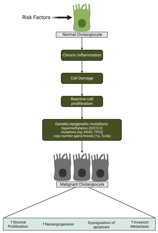 The figure in the paper succinctly outlines the molecular mechanisms behind cholangiocarcinoma development, featuring key elements such as genetic mutations (KRAS, TP53, BRAF), chronic inflammation’s role, epigenetic changes, and dysregulated signaling pathways [4].