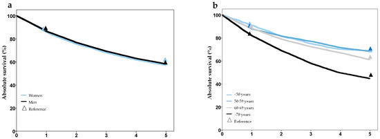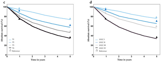Survival after laryngeal cancer stratified by gender (a), age group (b), T-stage (c), and UICC-stage (d), based on synthesized cohort data (dataset C32-3). Triangles show reference values from the Cancer Registry Schleswig-Holstein.