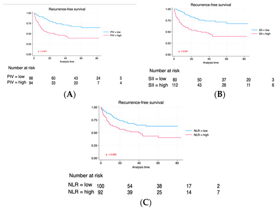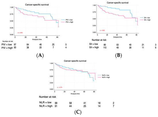 Individuals with elevated PIV experienced a reduced follow-up duration (36 vs. 23 months, p < 0.001). Likewise, individuals exhibiting a high SII also exhibited a reduced median follow-up duration (24 vs. 37 months, p = 0.002). Although patients with high NLR exhibited a shorter median follow-up, the difference did not reach statistical significance (27 vs. 32 months, p = 0.14). Through the follow-up duration, recurrences occurred in 74 (38.3%) individuals, and 96 (49.7%) patients succumbed, with 52 (26.9%) of these fatalities linked to neoplasm. Figure 2 compares RFS between PIV, SII, and NLR groups. The Kaplan–Meier estimate curves revealed significantly poorer survival outcomes across all three biomarkers regarding relapse-free interval (RFS). Figure 3 illustrates a correlation regarding Cancer-specific Survival (CSS) for PIV, SII, and NLR. Individuals exhibiting elevated PIV and SII levels experienced a notably diminished Cancer-specific survival rate (CSS) compared to those with lower PIV and SII levels (p = 0.05 and p = 0.02), respectively. There was no significant difference for CSS regarding the NLR biomarker between high NLR and low NLR. Lastly, we evaluated the overall survival among the three groups (Figure 4). As can be seen in Figure 4, individuals with an elevated PIV, SII, and NLR had lower overall survival than those with lower values (p < 0.001, p < 0.001, and p = 0.04), respectively.