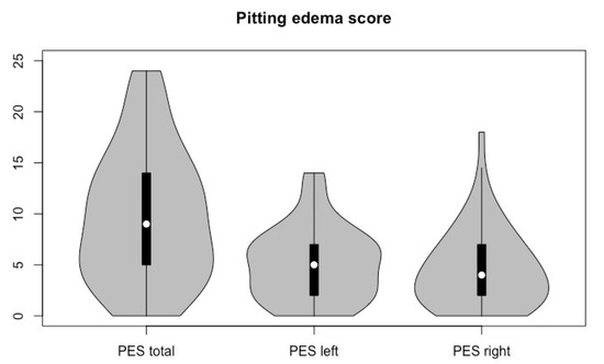 Violin plot of pitting lymphedema scores.