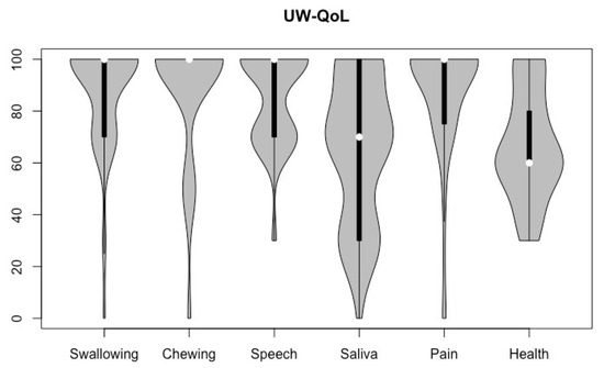 Violin plot of UW-QoL V4 domains of all participants (higher scores indicate better QoL).