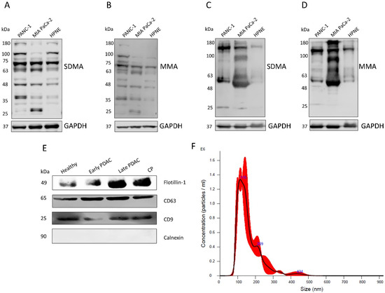 Validation of the arginine methylation antibodies and the sEVs isolated from human plasma. (A,B) Western blot detection of SDMA and MMA in PANC-1, MIA PaCa-2 and HPNE cell lysates. (C,D) Western blot detection of SDMA and MMA in PANC-1, MIA Paca-2 and HPNE cell derived sEV lysates. (E) Western blot detection of exosome markers (Flotillin-1, CD63 and CD9) and the negative marker, Calnexin, in human plasma sEVs. (F) Particle size determination of plasma sEVs using nanoparticle tracking analysis (NTA).