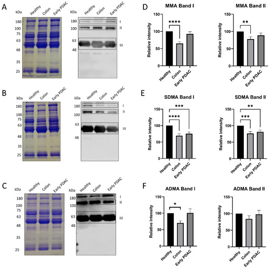 Semi-quantification of the Western blot bands demonstrated that the intensities of the top two bands in SDMA detection were reduced up to 40% in patients with early-stage PDAC and colon cancer compared with that of matched healthy subjects (Figure 2E). However, the intensities of the corresponding MMA and ADMA bands were only altered in patients with colon cancer but not patients with early-stage PDAC (Figure 2D,F).