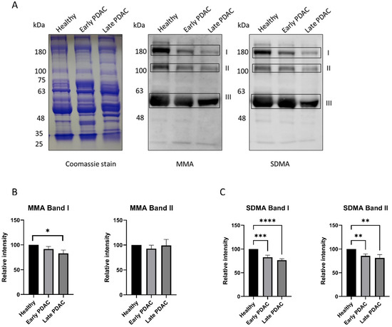 Arginine methylation patterns in plasma sEVs derived from healthy subjects and patients with early- and late-stage PDAC. Western blot of individual plasma sEV lysates was performed using antibodies against MMA and SDMA. Representative gels are shown. (A) MMA and SDMA detection in plasma sEVs derived from patients with early- and late-stage PDAC: (left), Coomassie blue staining of the gel as loading control; (middle), detection of MMA; (right), detection of SDMA. (B) Quantification of MMA bands I and II. (C) Quantification of SDMA bands I and II. **** p < 0.0001, *** p < 0.001, ** p < 0.01, * p < 0.05, one-way ANOVA followed by Dunnett’s multiple comparisons (n = 23 for early-stage PDAC and 22 for healthy subjects, n = 10 for late-stage PDAC).