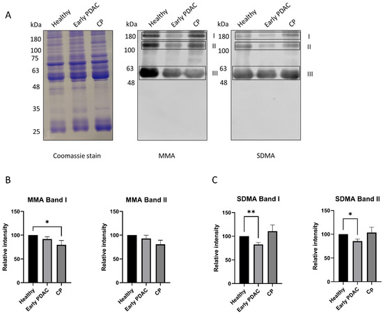Arginine methylation patterns in plasma sEVs derived from healthy subjects and patients with early-stage PDAC and chronic pancreatitis (CP). Western blot of plasma sEV lysates was performed using antibodies against MMA and SDMA. Representative gels are shown. (A) MMA and SDMA detection: left, Coomassie blue staining of the gel as loading control; middle, detection of MMA; right, detection of SDMA. (B) Quantification of MMA band I and II. (C) Quantification of SDMA band I and II. * p < 0.05, ** p < 0.01, one-way ANOVA followed by Dunnett’s multiple comparisons (n = 23 for early-stage PDAC and 22 for healthy subjects, and n = 8 for CP).