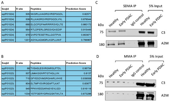 Validation of arginine methylation of Complement C3 and Alpha-2-macroglobulin. (A) Arginine methylation of Complement C3 and (B) Alpha-2-macroglobulin predicted by PRmePRed. (C,D) Western blot detection of Complement C3 and Alpha-2-macroglobulin in the immunoprecipitated fraction of plasma sEV lysates ((C), SDMA; (D) MMA).