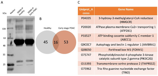 Proteomics analysis of the SDMA immunoprecipitated plasma sEV proteins from patients with early-stage PDAC and matched healthy subjects. Plasma sEV lysates (n = 18/group, pooled samples) from early-stage PDAC and healthy controls were immunoprecipitated with the SDMA antibody followed by proteomics analysis. (A) Western blot validation of immunoprecipitation by the SDMA antibody using PANC-1 cell lysates. (B) Venn-diagram showing numbers of arginine-methylated proteins that are shared or exclusively present in plasma sEV lysates from patients with early-stage PDAC (total 69 proteins) and healthy subjects (total 61 proteins). (C) Selected proteins that are exclusively arginine-methylated and closely associated with human cancer.