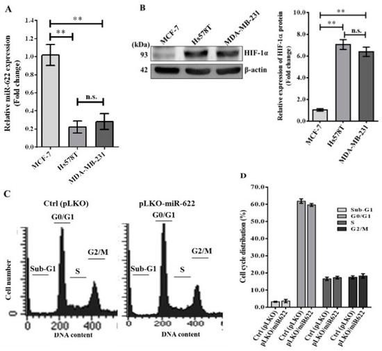 Illustration of the cell cycle analysis in breast cancer cells treated with miR-622. (A) Evaluation of miR-622 levels in both non-metastatic (MCF-7) and metastatic (Hs578T and MDA-MB-231) breast cancer cell lines. Quantification of the relative miR-622 levels was performed using TaqMan real-time PCR and normalized to RNU6B. (B) Analysis of HIF-1α protein expression by Western blotting. Quantification of HIF-1α protein levels with β-actin serving as an internal control. Data are presented as means ± S.D. (n = 3). n.s. indicates non-significant and ** denotes p < 0.01. (C) Cells were transfected with pLKO alone (control, Ctrl) or pLKO with miR-622 (pLKO-miR-622) for 48 h. Flow cytometry was used to analyze the percentage of cells at each stage of the cell cycle after DNA staining with propidium iodide. (D) Determination of the percentages of cells in different stages of the cell cycle. Data represent the means ± S.D. of three independent experiments. The original western blot figures can be found in File S1.