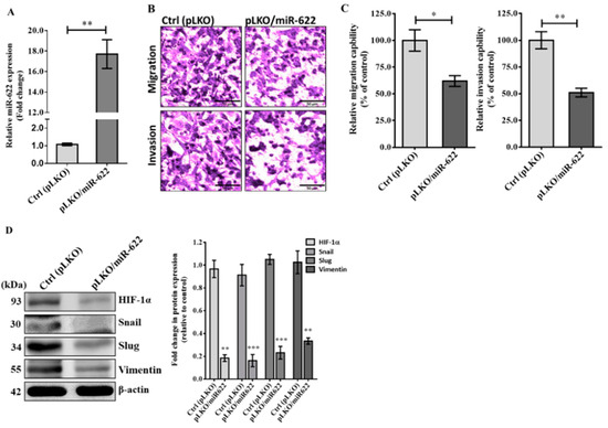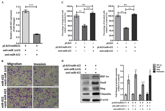 Furthermore, the substantial increase in miR-622 levels observed in miR-622-transfected MDA-MB-231 cells was effectively reduced after treatment with a specific anti-miRTM miRNA inhibitor for miR-622 (anti-miR-622) (Ambion, Inc., Austin, TX, USA) (Figure 3A). A significantly higher proportion of breast cancer cells demonstrated a twofold increase in migration and invasion capabilities when pLKO/miR-622 transfectants were treated with the miR-622 inhibitor in the transwell migration assay, compared to cells transfected with the pLKO/miR-622 (Figure 3B,C). Western blot analysis revealed restoration of HIF-1α levels and significantly elevated levels of Snail, Slug, and vimentin proteins in MDA-MB-231 cells transfected with pLKO/miR-622 after treatment with an inhibitor targeting miR-622 (Figure 3D).