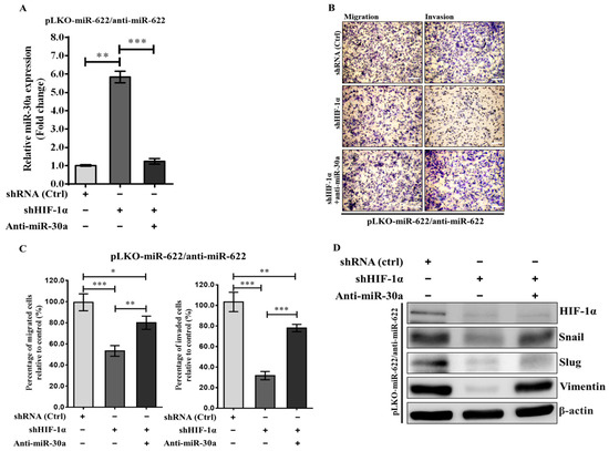 In our previous studies, we identified Slug and Vimentin mRNAs as direct targets of miR-30a [12,13]. This current research underscores the potential of miR-622 to inhibit metastasis in breast cancer cells by targeting HIF-1α, counteracting mesenchymal proteins (Figure 2). Expanding on this knowledge, our current investigation explores the molecular mechanisms involving miRNA synergy, specifically the interaction between miR-622 and miR-30a, that govern the inhibitory effects on breast cancer cell metastasis. We focus on the potential role in inhibiting HIF-1α-mediated EMT through miR-30. Initially, we used short-hairpin RNA against HIF-1α (shHIF-1α) to silence HIF-1α protein expression. This intervention resulted in an approximate sixfold increase in miR-30a levels in MDA-MB-231 cells transfected with pLKO/miR-622 when coadministered with the miR-622 inhibitor. The induction of the miR-30a level was reversed when treated with the miR-30a inhibitor (anti-miR-30a) (Figure 4A). Concurrently, shHIF-1α-knockdown treatment in MDA-MB-231–pLKO/miR-622 cells administered the miR-622 inhibitor led to a significant reduction of more than 50% in migration and invasion activity compared to negative control (shRNA, ctrl) in the transwell assay (Figure 4B,C). This suppression was reversed when anti-miR-30a was added to MDA-MB-231 cells carrying pLKO/miR-622 and then treated with an miR-622 inhibitor (Figure 4C). The results of the Western blot assay showed suppression of EMT-related proteins when shHIF-1α was introduced (Figure 4D). On the contrary, elevated levels of mesenchymal markers, including Snail, Slug, and vimentin, were observed when miR-622-overexpressing MDA-MB-231 cells were treated with anti-miR-622 and sequentially cotreated with shHIF-1α and anti-miR-30a (Figure 4D). These collective findings highlight the crucial role of miR-622, demonstrated by its interaction with HIF-1α in the management of antimetastatic effects. This regulation is achieved by modulating miR-30a expression, which disrupts the EMT process in invasive breast cancer.