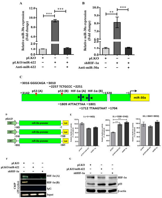 MiR-622 upregulates the level of miR-30a through the repression of HIF-1α. Quantification of miR-30a level using qRT-PCR in MDA-MB-231 cells transfected with pLKO/miR-622 after treatment with the miR-622 inhibitor (anti-miR-622) is shown in (A) and in (B) after HIF-1α knockdown (shHIF-1α) along with the miR-30a inhibitor (anti-miR-30a) in MDA-MB-231 cells. RNU6B served as an internal control. (C) Schematic representation of miR-30a promoter regions inserted upstream of the pGL4.21 vector. (D) Schematic overview of various luciferase reporter constructs from the miR-30a promoter region and the results of the promoter activity assay performed in MDA-MB-231 cells transfected with pLKO/miR-622 or subjected to HIF-1α-knockdown treatment (shHIF-1α). The data histograms and error bars indicate the means ± S.D. of the independent samples in triplicate. Statistical significance is denoted by asterisks: ** p < 0.01 and *** p < 0.001. (E) Representation of nucleotide sequences that encompass two HIF-1α- and p53-binding motifs within the promoter region (nt −1328~−3142) of miR-30a. (F) Identification of two binding motifs to the HIF-1α of the miR-30a promoter region was performed using a chromatin immunoprecipitation (ChIP) assay against an HIF-1α-specific antibody. IgG served as a negative control. (G) Representative Western blot indicates HIF-1α and p53 proteins in cells treated with pLKO/miR-622 or shHIF-1α with β-actin utilized as internal control. The original western blot figures can be found in File S1.