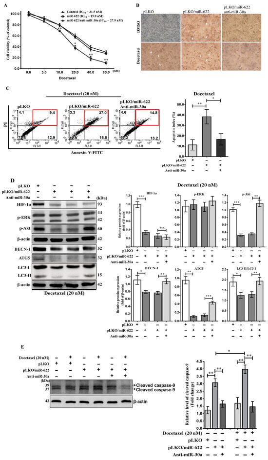 Restoration of docetaxel sensitivity in breast cancer cells through miR-622-induced expression of miR-30a. (A) Evaluation of the impact of miR-622 on MDA-MB-231 cell viability after a 48 h treatment with varying concentrations of docetaxel, as indicated, using the MTT assay. (B) Representative images of cells exposed to docetaxel (20 nM) or carrying pLKO/miR-622 captured using an inverted phase contrast microscope at a magnification of 200×. The white arrow indicates a shrunken morphology with rounded cell bodies. (C) Apoptosis assay using flow cytometry after staining with annexin V–FITC/propidium iodide (PI). Representative scatterplots of PI (y-axis) versus annexin V (x-axis). Apoptotic cells are indicated by a red frame. Data are presented as apoptotic cells based on independent experiments performed in triplicate and analyzed by FACS. (D) Representative images of Western blot analysis showing HIF-1α- and autophagy-related proteins and (E) caspase 9 activation (cleaved caspase 9) under 20 nM docetaxel in conjunction with various treatments as indicated. The densitometric analysis of the protein bands was performed using Digital Protein Imagineware, with β-actin serving as an internal control. Data are presented as the means ± S.D. of three independent experiments. n.s., non-significant and statistical significance is indicated as * p < 0.05, ** p < 0.01, *** p < 0.001. The original western blot figures can be found in File S1.