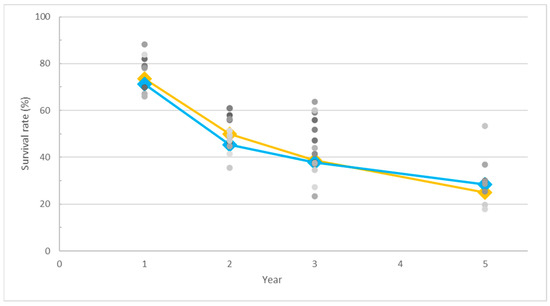 The gray dots show the actual survival rates for both squamous cell carcinoma (SCC) and adenocarcinoma (AC). Different gray dots represent each particular study. We considered the number of cases to analyze the survival trends and created the line on the graph. The blue line represents SCC, and the light orange line represents AC in the overall survival curve.