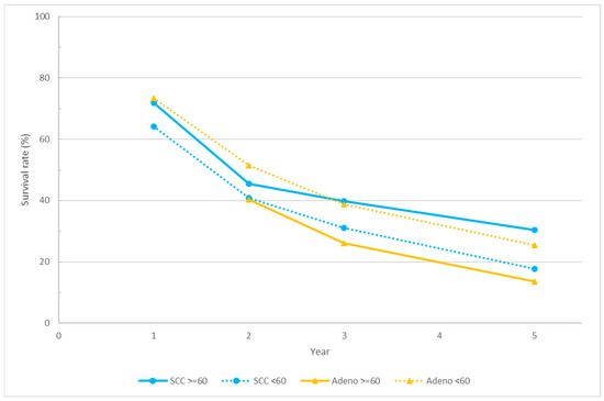 The temporal dynamics of the survival rate trends for both histological groups exhibited noteworthy similarities. In the initial year, comparable survival rates were observed for both SCC and AC. However, a notable decline ensued from the first to the second year, indicative of a critical period post-treatment. Subsequently, the rate of decline decelerated, leading to a more gradual incline in survival rates from the second to the fifth year.