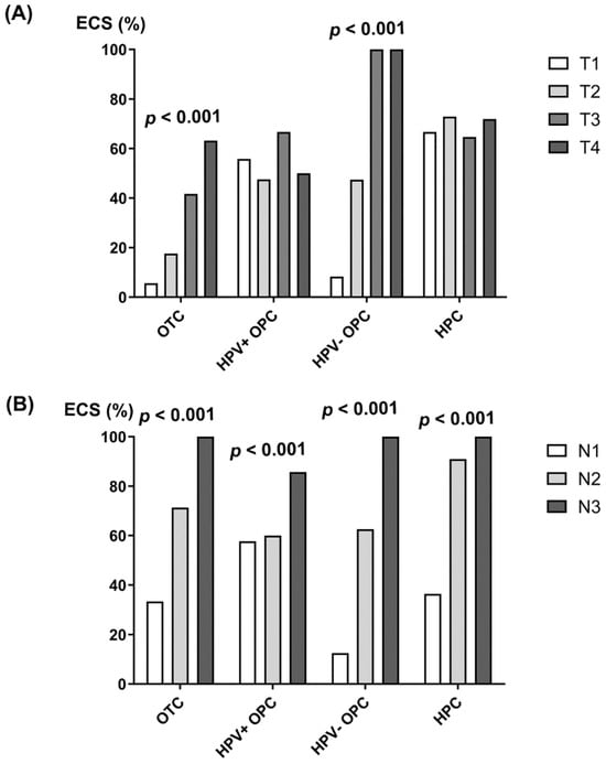 ECS percentage according to (A) T and (B) N status in OTC, HPV-positive and HPV-negative OPC, and HPC; p-values were calculated by the Cochran–Armitage trend test.