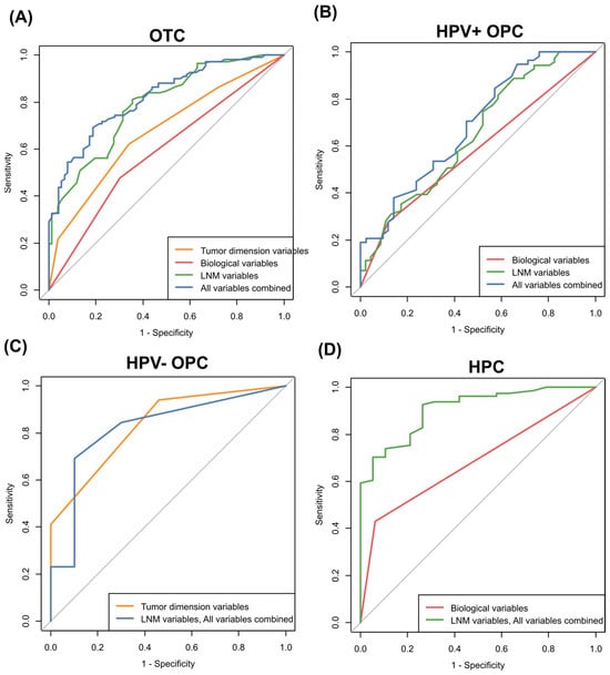 Receiver operating characteristics (ROC) curve analyses to estimate the predictability of ECS according to tumor physical, biological, and LNM variables at each tumor subsite. Areas under the curves (AUCs) were compared among the models: (A) OTC: AUC of a model using tumor dimensional variables = 0.672, AUC of a model using biological variables = 0.587, AUC of a model using LNM variables = 0.788, AUC of a model using all variables combined = 0.819; p-value for the difference between models was <0.001, except for the p-value of LNM variables and all variables (0.049). (B) HPV-positive OPC: AUC of a model using tumor biological variables = 0.578, AUC of a model using LNM variables = 0.647, AUC of a model using all variables combined = 0.687; p-values for the difference between models were >0.05. (C) HPV-negative OPC: AUC of a model using tumor dimension variables = 0.835, AUC of a model using LNM variables = 0.821, AUC of a model using all variables combined = 0.823; p-values for the difference between models were >0.05. (D) HPC: AUC of a model using biological variables = 0.684, AUC of a model using LNM variables = AUC of a model using all variables combined = 0.907; p-value for the difference between tumor biological variables and LNM variables was <0.001.