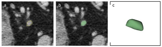 The same LNs analyzed with the morphological score were then segmented by using open-source 3D Slicer software (version 4.11.20210226, https://slicer-packages.kitware.com/#item/60add6fdae4540bf6a89bf73 (accessed on 31 January 2024) on portal-venous phase. Slice-by-slice, a volumetric region of interest was manually drawn with the goal of covering total LN’s volume and avoiding perinodal vessels and other organs (Figure 1).