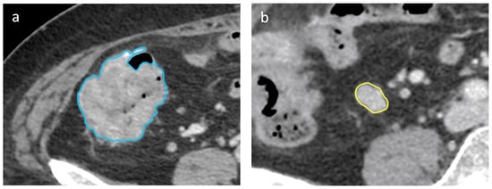 Axial portal-venous phase abdomen CT images from an 89-year-old woman with a histologically proven diagnosis of colon cancer. Abdomen CT image shows manually-drawn region of interest of the (a) primary lesion (in blue) and of the (b) regional lymph node (in yellow) for radiomic volumetric segmentation.