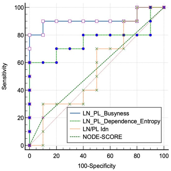 After the demonstration of significant differences between the selected radiomic features of LNs compared with PLs, we proposed a possible easy-to-use application expressed by a ratio between the value of the LN and the PL. This evaluation discriminates negative LNs better than morphologic NODE-SCORE for dependence entropy and busyness. The idea of a ratio between the two entities, which is able to discriminate between healthy homogeneous tissue and malignant heterogeneous tissue, relies on similar concept obtained in nuclear medicine. Example are provided by Cho J et al. [], with higher performances of the SUV ratio between LNs and PLs, and by Chen P J and colleagues [] that demonstrated the better performances of a SUV ratio between LNs and PLs in esophageal cancer in terms of survival.