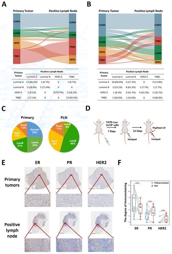 Subtype changes between primary tumors and PLN. (A) Subtype concordance between primary tumor and positive lymph node in the tissue microarrays of 47 breast cancer patients. (B) Subtype concordance between primary tumor and positive lymph node in 64 breast cancer patients collected from the hospital. (C) Distribution of PAM50 intrinsic subtype in primary tumors versus PLN, n = 24. (D) The schematic picture of the popliteal lymph node metastasis model, n = 8. (E) The expression of estrogen receptor, progesterone receptor, and HER2 in footpad primary tumor in situ and its paired positive popliteal lymph node of nude mice. Top, 5× magnification (scale bar, 160 μm); bottom, 200× magnification (scale bar, 10 μm), n = 8. (F) The degree of ER, PR, and HER2 immunostaining in footpad primary tumor in situ and its paired positive popliteal lymph node of nude mice, n = 8.