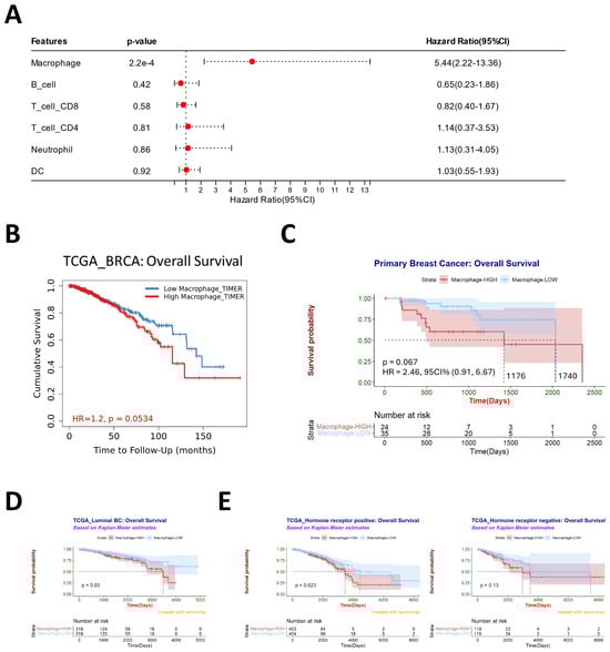 Macrophages play an essential role in breast cancer. (A) The multivariate Cox hazards regression analysis of multiple immune cell types in breast cancer. The immune cell infiltration was assessed by TIMER 2.0. Hazard Ratio < 1: reduction in hazard, Hazard Ratio = 1: no effect, and Hazard Ratio > 1: increase in hazard. Data from TCGA. (B) Survival analysis of macrophages in breast cancer, data from TCGA, n = 1100. TIMER 2.0 performed the Cox Proportional Hazard Model and Kaplan–Meier survival curves. (C) The degree of primary CD68+ macrophage infiltration and clinical prognosis of 59 breast cancer patients we collected from the hospital were analyzed using the optimal truncation ratio. (D) Survival analysis of macrophages in luminal breast cancer, data from TCGA, and the infiltration degree of macrophages were grouped using TIMER 2.0, n = 638. (E) Survival analysis of macrophages in HR+/HR− breast cancer, data from TCGA, and the infiltration degree of macrophages were grouped using TIMER 2.0, n = 907. R 4.3.1 software and KM-Plotter performed Kaplan–Meier survival curves and Log-rank statistical analysis in (C,E).
