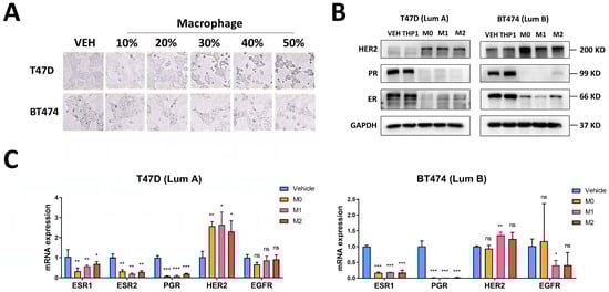 Macrophages induce changes in hormone receptors and HER2. (A) Morphological changes of breast cancer cells treated with different gradient M2 macrophages conditioned medium, 200× magnification. (B,C) Protein and mRNA levels of hormone receptors and HER2 in breast cancer cells treated with macrophage conditioned medium. The original western blot figures can be found in File S1. Data present as mean ± SEM, ns indicates p > 0.05, * p < 0.05, ** p < 0.01, *** p < 0.001.