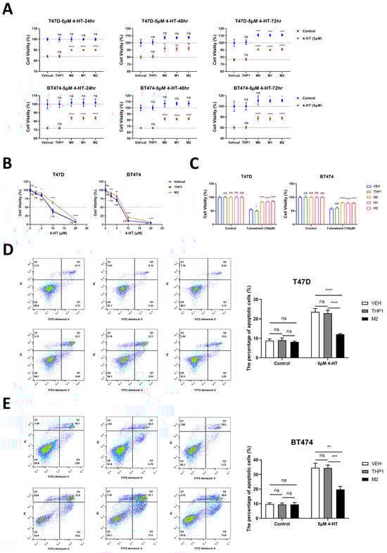 To investigate the role of macrophages in the development of tamoxifen resistance, we administered a 20% conditioned culture medium from macrophages to T47D or BT474 cells, followed by treatment with 4-HT or fulvestrant. Upon treating T47D or BT474 cells with 4-HT, the CCK-8 assay results revealed that the group treated with macrophages exhibited reduced resistance to 4-HT. This was evident through increased cell viability at different time points (Figure 4A), a higher IC50 value (Figure 4B), and decreased apoptosis levels (Figure 4D,E). Upon treatment with 100 nM fulvestrant, the CCK-8 results showed that the macrophage-treated group had higher cell viability (Figure 4C).
