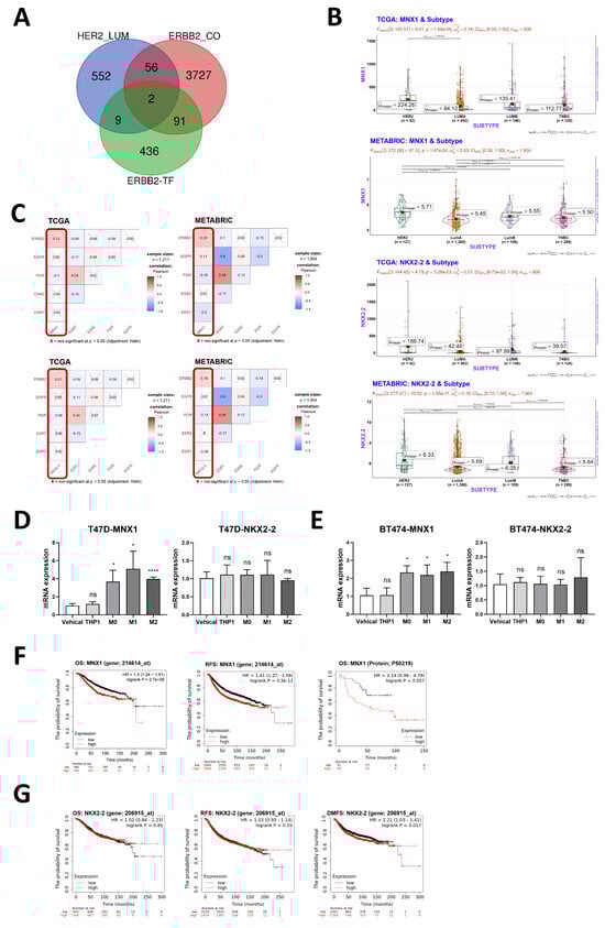 Macrophages may regulate the expression of hormone receptors and HER2 through the MNX1 transcription factor. (A) The three data sets from TCGA were differential genes highly expressed in HER2-E breast cancer compared with Luminal breast cancer, gene sets coexpressed with ERBB2, and transcription factors that may regulate ERBB2. (B) MNX1 and NKX2-2 gene expression levels in four breast cancer subtypes, data from TCGA and METABRIC. (C) Correlation analysis of gene expression levels of 2 transcription factors and ESR1, PGR, ERBB2, and PGR, data from TCGA and METABRIC. (D,E) mRNA expression levels of MNX1 and NKX2-2 after macrophages or THP1 conditioned medium treatment. Data present as mean ± SEM, ns indicates p > 0.05, * p < 0.05, **** p < 0.0001. (F) Survival curve analysis between MNX1 gene and protein expression level and clinical prognosis in breast cancer, data from KM-Plotter. (G) Survival curve analysis between NKX2-2 gene expression level and clinical prognosis in breast cancer, data from KM-Plotter.