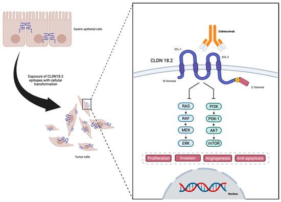Representation of CLDN18.2 in gastric cancer cells, and structure and interaction with anti-CLDN18.2 Zolbetuximab—designed in Biorender.