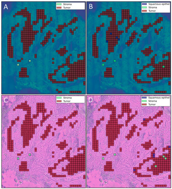 Ground truth class labels for each tile (A) and predicted class labels for each tile (B) on a sample SRS image. Both true tiles with class label “Stroma” were classified correctly, whereas 6 tiles with class label “Tumor” were incorrectly classified as “Squamous epithelium” (5 tiles) and “Stroma” (1 tile). Ground truth class labels for each tile (C) and predicted class labels for each tile (D) on a sample SRH image. Both true tiles with class label “Stroma” were classified correctly, whereas 8 tiles with class label “Tumor” were incorrectly classified as “Squamous epithelium” (5 tiles) and “Stroma” (3 tiles).