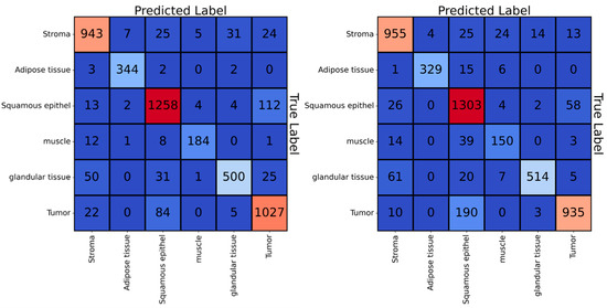 Confusion matrices for the classification of the CNN on the SRS test dataset (left) and the corresponding SRH test dataset (right). The diverging colormap shows small values in dark blue with increasing brightness according to increasing values. Large values are shown in dark red with decreasing brightness according to increasing values.