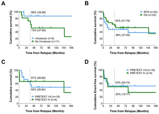 Survival Curves of Note for our Relapse Patients. (A) Overall-survival from relapse for those patients who were treated with irinotecan during relapse and those who were not. Those patients who did not receive irinotecan during follow-up appeared to have a poorer OS from relapse than those who did. The 2 patients who received palliative chemo have been removed from this analysis. This difference was not statistically significant (Log Rank (Mantel–Cox), p = 0.118); (B) Overall survival (OS) versus event free survival (EFS) from relapse for the HB relapse patients in this study. There was no significant difference between OS and EFS from relapse in this group of patients (Log Rank (Mantel–Cox), p = 0.447); (C) Overall survival (OS) from relapse for PRETEXT group I–III patients as compared to PRETEXT group IV patients. There was no significant difference in terms of OS from diagnosis between these groups of patients (Log Rank (Mantel–Cox), p = 0.797); (D) Event Free Survival (EFS) from relapse for PRETEXT group I-III patients as compared to PRETEXT group IV patients. There was no significant difference in EFS between these groups of patients (Log Rank (Mantel–Cox), p = 0.857).
