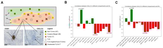 Schematic and histologic evaluation of TLS as well as CXCL13+ cells in different compartments. (A) IHC slide for assessing CXCL13+ cells in different compartments, including T, IM, TLS, and NT. (B) Spearman correlation coefficient in different compartments between CXCL13+ cells and OS, and (C) between CXCL13+ cells and PFS. T, tumor; IM, invasive margin; TLS, tertiary lymphoid structures; TLSin, inside TLS; TLSne, neighborhood of TLS; NT, non-tumor. TME, tumor microenvironment. A green color indicates a positive correlation whereas a red color indicates a negative correlation.