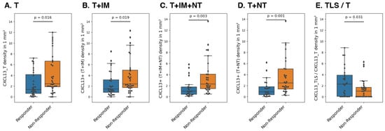 Secondly, we investigated if the responders (PFS ≥ 1 year) and non-responders (PFS < 1 year) displayed differences in the density of CXCL13+ cells in each TME compartment. We observed that responders had a significantly lower CXCL13+ cell density in the tumor (p = 0.016), even considering the surrounding area of the tumor (CXCL13+ (T+IM), p = 0.019; or CXCL13+ (T+IM+NT), p = 0.003; or CXCL13+ cells (T+NT), p = 1.5 × 10−3) (Figure 2A–D). However, we found a greater density of CXCL13+ cells in TLSs compared to the tumor (CXCL13_TLS/CXCL13_T ratio, p = 0.031 (Figure 2E)) in responders vs. non-responders, which is believed to be influenced by interaction between CXCL13+ and CD20+ cells within the TLS compartment [9,22].