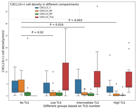Our investigation focused on two aspects: first, understanding the notable increase in CXCL13+ cell density when transitioning from NT to T regions, and second, examining the transition in CXCL13+ cell density from T to TLSs in the presence of TLSs. We explored the idea that CXCL13+ cells move into the TLS to interact with CD20+ cells, potentially triggering the recruitment of additional immune cells. In order to test this prediction, we equally categorized patients into four groups based on TLS number (none, low, intermediate, and high). The characteristics of these groups are shown in Supplementary Table S12. Then, we compared the density of CXCL13+ cells in each compartment and group. We found that for patients without TLSs, the CXCL13+ cell density was significantly higher in IM compared to patients with low TLSs (p = 0.02), intermediate TLSs (p = 0.005), and high TLSs (p = 0.002) (Figure 3). Based on these results, we concluded that when at least two TLSs are present (the presence of only one TLS was not significant and did not seem logical for this comparison, Supplementary Figure S4), CXCL13+ cells had a chemotactic link and migrated toward T and finally to the TLS compartment. Interestingly, we did not find any significant differences in the density of CXCL13+ cells in IM between patients with low, intermediate, and high TLSs, suggesting that having a minimum of two TLSs is adequate for CXCL13+ cells to have a migratory from NT toward to IM, T, and finally to TLS compartments (Figure 3).