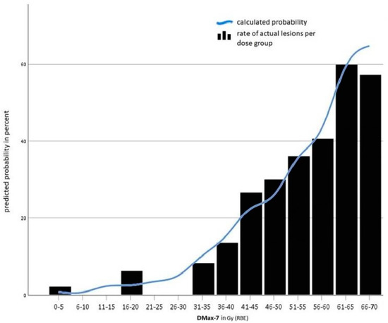 All investigated dose variables had a highly significant influence on the development of lesions. With a mean DMax-7 of 33.09 Gy (RBE) in the cohort without lesions and 49.06 Gy (RBE) in the cohort with lesions, the highest significance level (p = 0.000000000019) was seen here. If the dose value is increased by 1 Gy (RBE), the likelihood of developing a lesion increased by the factor of 1.087 (95% confidence interval 1.062–1.114).