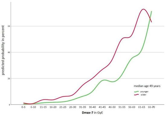 As in the univariable analysis, age and DMax-7 were also significant in the multivariate analysis with a p-value < 0.05. Figure 2 shows the probability in all age groups of suffering from a temporal lobe lesion depending on DMax-7 as well as the rate of lesions in the corresponding dose group. As shown in Figure 3, the probability of suffering from a temporal lobe reaction is age-dependent. Except in the highest dose group (66–70 Gy (RBE)), patients older than the median age of 49 had an increased risk of suffering from a temporal lobe reaction.
