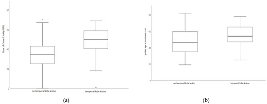 The boxplots in Figure 4a,b show the distributions of DMax-7 and patient age in the groups with and without temporal lobe lesions.