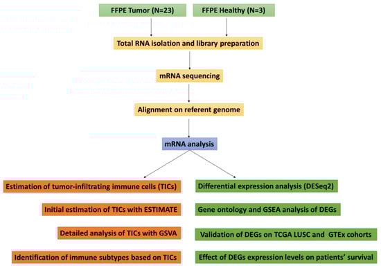 The whole transcriptome sequencing of formalin-fixed, paraffin-embedded (FFPE) SqCLC samples, coupled with FFPE healthy control tissue, was performed. Additionally, various transcriptomic profile analyses, including the identification of differentially expressed genes, Gene Ontology, and gene-set enrichment analysis, were performed. The level of immune cells infiltrating tumor tissue was also estimated. The sequencing results of the TCGA (The Cancer Gene Atlas)-LUSC and GTEx (Genotype-Tissue Expression) cohorts were included to validate differentially expressed genes identified in the experimental cohort. Finally, the impact of expression levels of validated differentially expressed genes on patients’ overall survival was examined. The systematic workflow of this study is graphically presented in Figure 1.