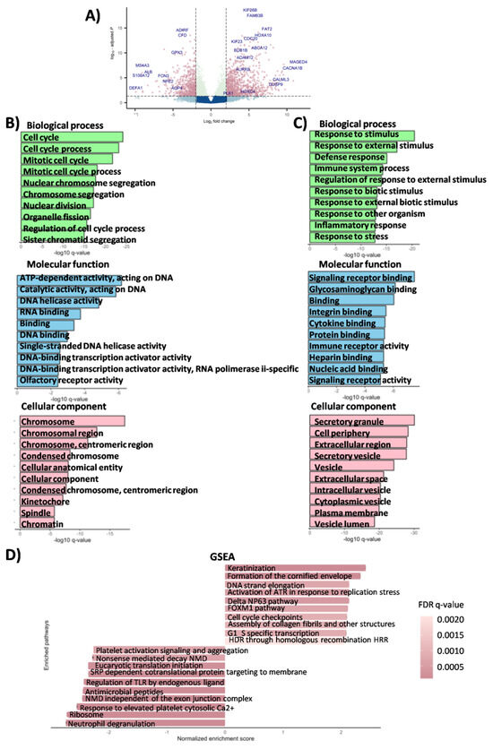 Results of the transcriptomic analysis obtained in the experimental cohort. (A) Volcano plot displaying differentially expressed genes (DEGs) in the experimental cohort of the SqCLC samples. Genes significantly differentially expressed in SqCLC compared to healthy controls are highlighted in pink. (B,C) Gene Ontology analysis (GO) for up- and downregulated genes in categories of Biological Process, Molecular Function, and Cellular Component (experimental cohort). (D) Enriched pathways in SqCLC tissue using Gene Set Enrichment Analysis (GSEA). The top 20 positively and the top 20 negatively enriched pathways are presented. The dot color indicates FDR q-values, with darker colors indicating higher significance.